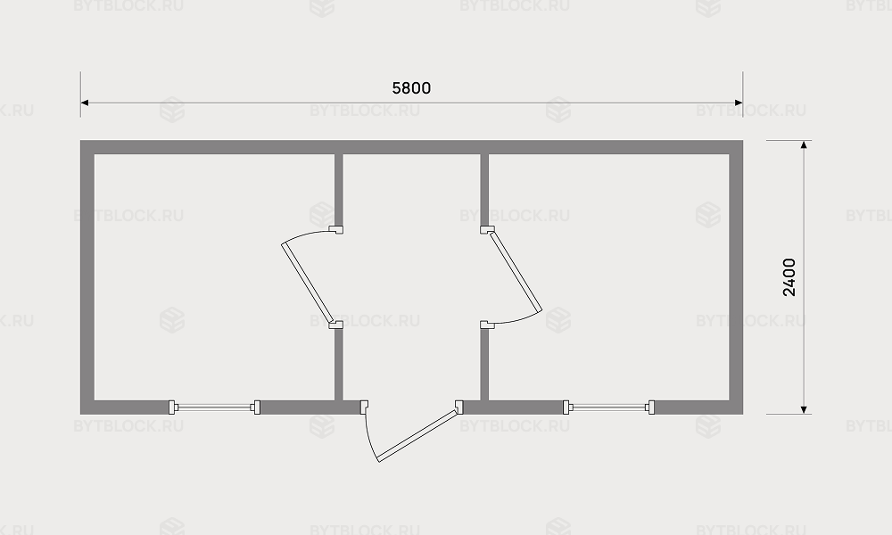 Блочно-модульной сооружение с планировкой «распашонка» состоит и3 помещений: сразу за входом находится общее пространство, из которого по левую и правую сторону находятся проходы в изолированные комнаты. Они могут использоваться для разных целей, гибкая планировка располагает к эксплуатации модуля в качестве медпункта, мини-офиса, торгового павильона.