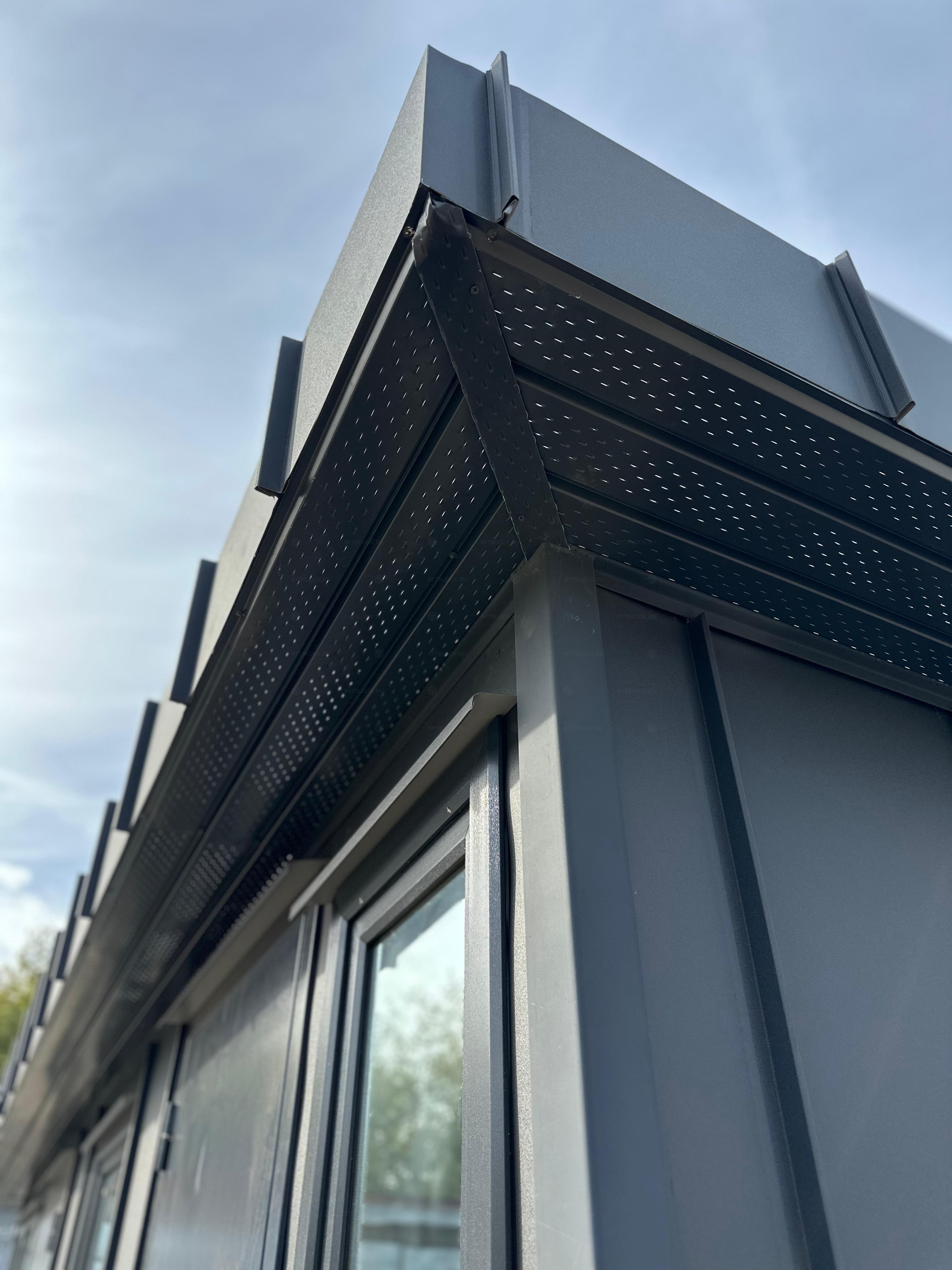 Основой контейнера служит прочный металлический каркас, выполненный из сварных швеллеров и уголков: это залог устойчивости и долгого срока службы. Крыша собрана из стального листа толщиной 0,7 мм и дополнительно защищена от протечек. Для наружной отделки использован современный клик фальц цвета RAL 7024, а дно усилено оцинкованным профилем. По периметру предусмотрен свес, который улучшает защиту от осадков и придает конструкции законченный вид.